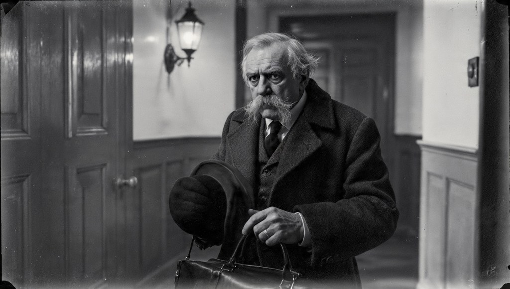 She opened the heavy oak door. The man standing in the mist was older than she expected, his coat heavy with moisture, his hat in his hands. He had a face like a worn saddle – lined, weathered, but kindly. He carried a leather bag that smelled of liniment and horse-oil.